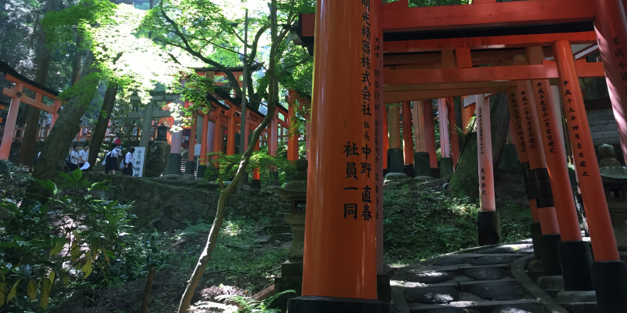 Onderweg kom je beelden tegen van een vos met een sleutel in zijn bek. Wat betekent dit? De tempel werd opgedragen aan Inari Okami, de Shinto-god van de rijst. De vos is een boodschapper van Inari Okami en brengt je de sleutel die toegang geeft tot de rijst.